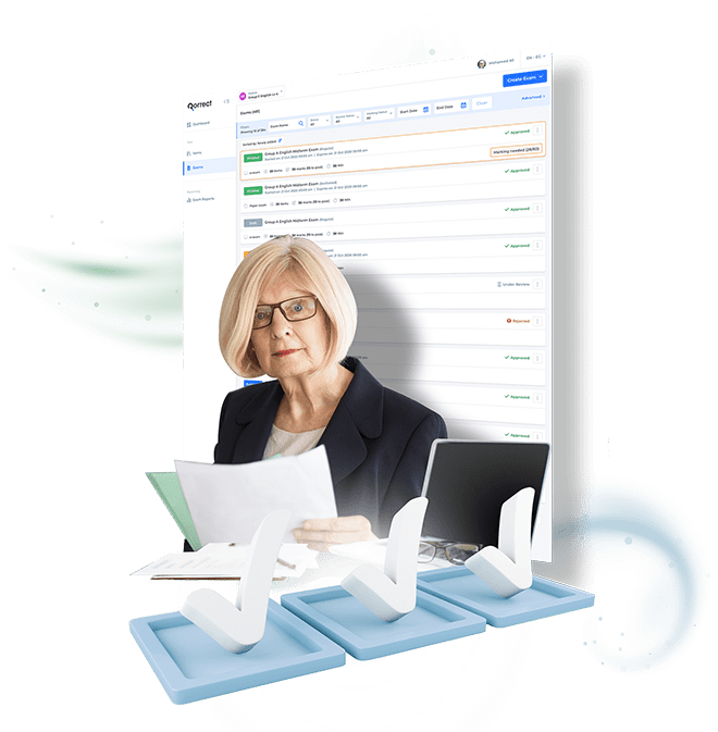 We support the reviewer's dashboard on Qorrect with numerous functions, e.g., reviewing items/questions and sending feedback to item creator (accept, reject with comment), reviewing exams and sending feedback to examiner (accept, reject with comment), and managing review reports as well